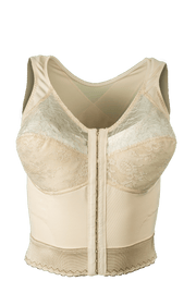 Longline bra offering soft cups with front closure. Designed with Special Supportive Bands to promote better posture and to provide relief to the upper and lower back. Wide straps to relieve shoulder strain. Wide anchor band for added stability.