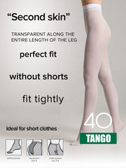 Semi-transparent TANGO tights with a light sheen and “Satin touch” effect give the skin an incredible sensation of softness. They fit snugly while remaining equally transparent along the entire leg. A great option for short outfits.