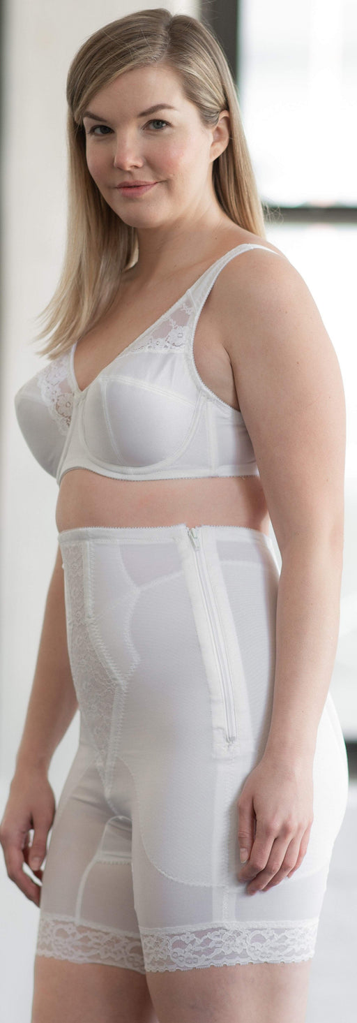 View full detailsRAGO Style 9357 This white lace open bottom body briefer features power-net lace, exclusive contour bands and metal garters for comfort and fit. Th...