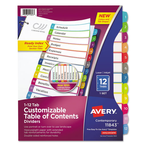 Avery Customizable TOC Ready Index Multicolor Tab Dividers, 12-Tab, 1 to 12, 11 x 8.5, White, Contemporary Color Tabs, 1 Set
