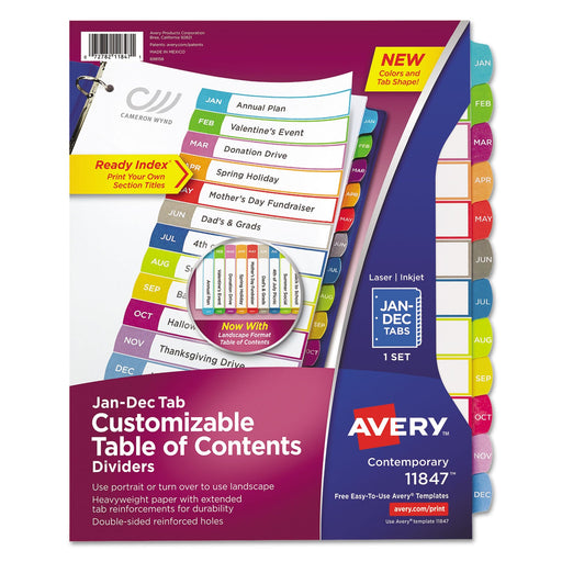 Avery Customizable TOC Ready Index Multicolor Tab Dividers, 12-Tab, Jan. to Dec., 11 x 8.5, White, Contemporary Color Tabs, 1 Set