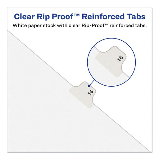 Rip Proof™ reinforced tabs printed on both sides with exhibit letter. Easy-to-read Helvetica bold type stands out. Unpunched for flexibility in bin...
