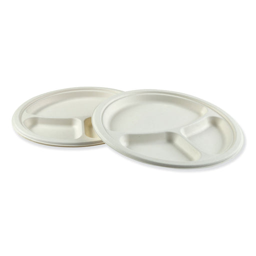 Boardwalk Bagasse Dinnerware, 3-Compartment Plate, 10" dia, White, 500/Carton