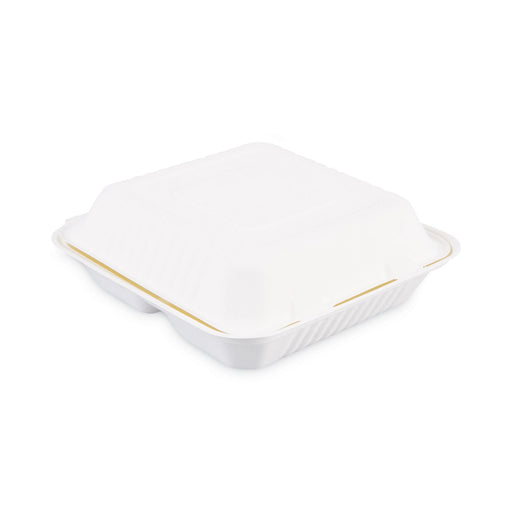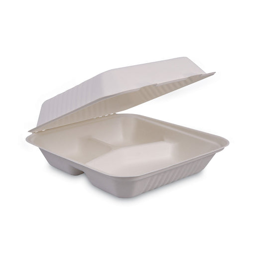 Boardwalk Bagasse Food Containers, Hinged-Lid, 3-Compartment 9 x 9 x 3.19, White, Sugarcane, 100/Sleeve, 2 Sleeves/Carton