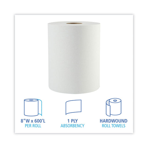 Boardwalk Hardwound Paper Towels, 1-Ply, 8" x 600 ft, White, 2" Core, 12 Rolls/Carton