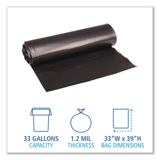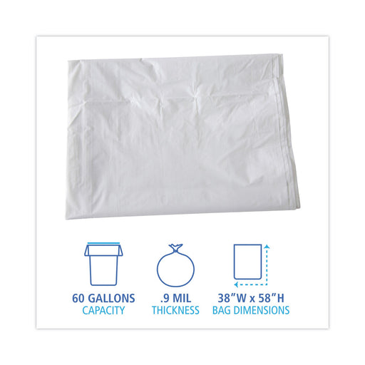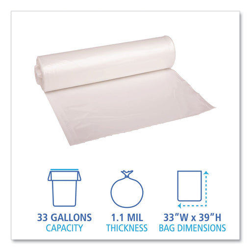 Can liner with equivalent strength of 2.0 mil liner. Perforated roll for easy dispensing. Coreless rolls save space and material.
