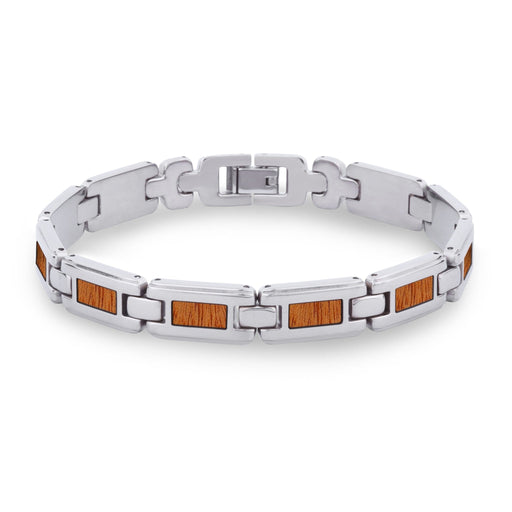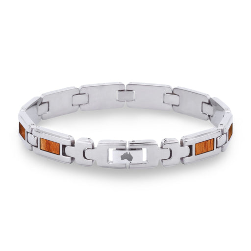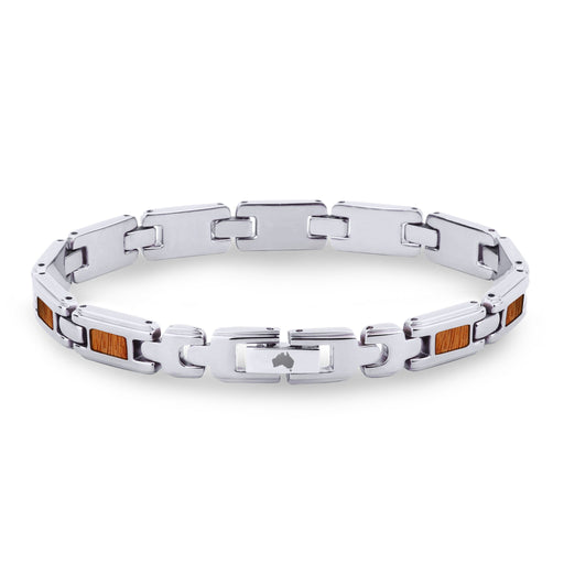 Men's stainless steel link bracelet with Australian Gum Burl (Tasmanian Oak/Stringybark) inlays. Links are removable to adjust for size. Metal: St...