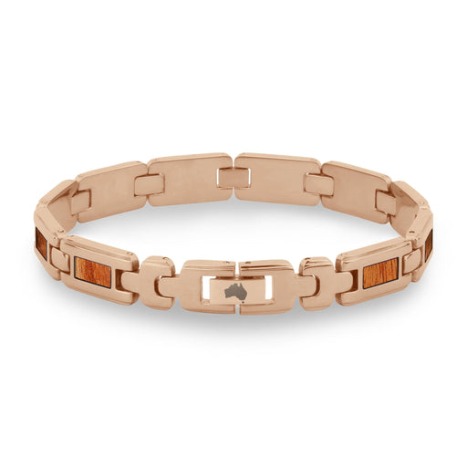 Men's Rose Gold plated stainless steel link bracelet with Australian Gum Burl (Tasmanian Oak/Stringybark) inlays. Links are removable to adjust for...