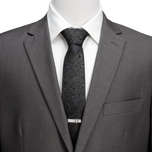 View full detailsA scattered paisley design in shades of black appears on this 100% silk charcoal gray tie. Look closely and you'll spot Iron Man's helmet logo subt...