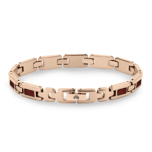 Men's Rose Gold plated stainless steel link bracelet with Australian Jarrah wood inlays. Links are removable to adjust for size. Metal: Rose Gold ...