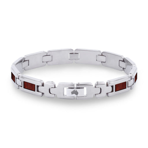 Men's stainless steel link bracelet with Australian Jarrah wood inlays. Links are removable to adjust for size. Metal: Stainless Steel Wood Inlay:...