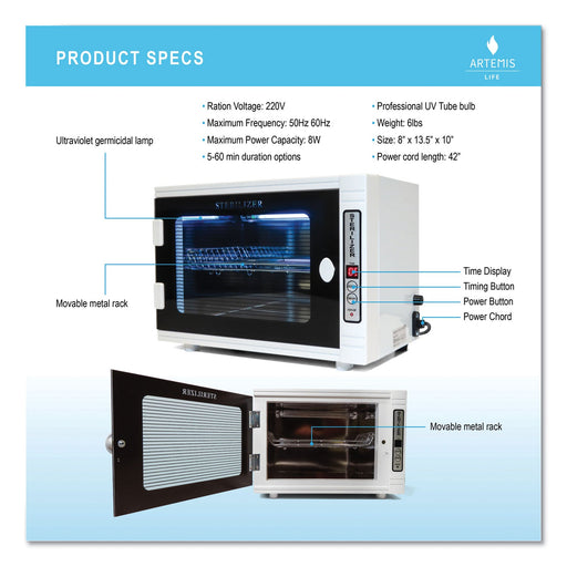 The Artemis UV Sterilizer Cabinet is a multi-purpose tabletop sterilizer that can be used to sterilize and disinfect a wide range of professional a...