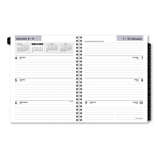 Weekly: one week per two-page spread; ruled block-style for open scheduling; past, current and two future months reference. Monthly: tabbed, full m...