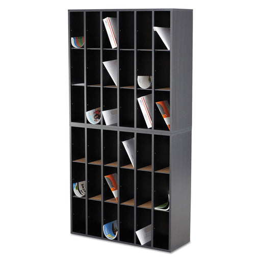 View full detailsStudy sorter made of 3/4" compressed wood with adjustable hardboard dividers. Stacks up to two high. Black plastic molding accent doubles as a labe...