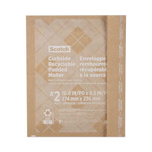 Scotch Curbside Recyclable Padded Mailer, #2, Bubble Cushion, Self-Adhesive Closure, 11.25 x 12, Natural Kraft, 100/Carton