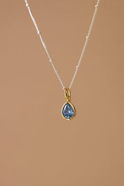 The Aqua Teardrop Necklace is an elegant two tone style necklace, perfect for pairing with both gold and silver pieces. The aqua colored cz charm adds a fun pop of color to accessorize any outfit.