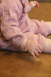 Meet the Avery! (Little girls and pink just go together, don't you think?) This bracelet features gorgeous light pink crystals as well as 18k gold plated stainless steel beads- they are the HIGHEST quality and are waterproof and won't tarnish! This double layered bracelet gives the double stacked bracelet look with the ease of just one clasp. It has no stretch but features a half inch extender chain to get a customized fit on your little! And in case you're interested in matching... this bracelet comes in adult sizes too!