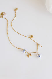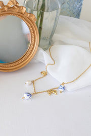 • Features 18k gold PVD plated stainless steel chain and charms, porcelain charms, and a freshwater pearl