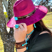 This stunning Blue Turquoise Ring set in Antique Copper exudes boho western style and perfectly coordinates with the matching necklace and bracelets. The antique copper setting beautifully complements the vibrant blue turquoise, making it a unique and eye-catching addition to your jewelry collection.