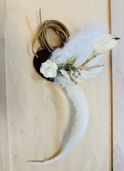 Elevate your boho western wedding with our bridal hat collection. This desert wedding inspired hat features neutral tones and a touch of blush pink. Our boho hat is adorned with cream roses, ivory daisys, white feathers, and additional floral picks. This pairs beautifully with pearls from our wedding collection and the larger bridal hat. Create an intimate and elegant boho western look for your special day! The item that you receive in the mail will resemble the one in the picture but, because every piece by Jewelry Junkie is handmade, it will not be identical.