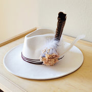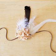 Elevate your boho western wedding with our bridal hat collection. This desert wedding inspired hat band features neutral tones and a touch of blush pink/peach/apricot. Adorn any hat with flowers, white feathers, and additional floral picks. This pairs beautifully with pearls from our wedding collection. Create an intimate and elegant boho western look for your special day!