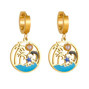 Bring the beauty of the ocean to your style with these Gold Tropical Paradise Hoop Earrings. Featuring intricate cutout designs of palm trees, dolphins, starfish, and a pearl accent, these earrings add a touch of tropical elegance to any look. The polished 18K gold-plated finish and vibrant enamel details make them a standout accessory for beach lovers and trendsetters alike.