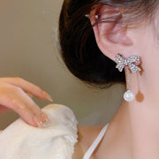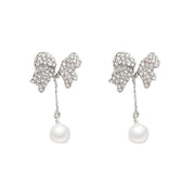 Crystal Rhinestone Bow Pearl Drop Stud Earrings