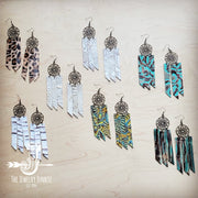 Expertly handcrafted, these Dream Catcher Earrings feature a unique boho western style that exudes a touch boho. Made with genuine leather fringe and a stunning print design, these earrings are perfect for adding a touch of rustic charm to any outfit. Embrace your inner fashionista with these one-of-a-kind accessories