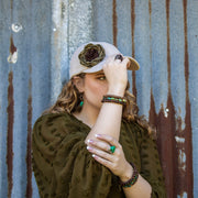 Expertly crafted with genuine natural HuBei turquoise, this bracelet exudes a boho western style. Each piece is handcrafted to ensure its authenticity and unique beauty. Elevate your look with this stunning bracelet, perfect for any occasion.