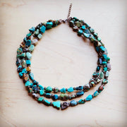 Expertly crafted in a boho style, this Triple Strand Necklace features beautiful handcrafted details featuring genuine HuBei Turquoise Stones. Elevate any outfit with the unique blend of natural turquoise and copper, making a statement that is both stylish and timeless. Add a touch of handmade luxury to your wardrobe.