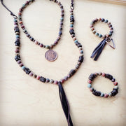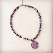This handcrafted Picasso Jasper Collar Necklace is the perfect accessory to add a boho touch to any outfit. Made with care and attention to detail, this beautiful necklace features a stunning Indian head pendant and is sure to catch the eye. Elevate your style with this unique and timeless piece.