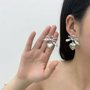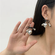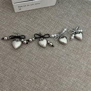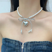 Heart Pendant White Imitation Pearl Bow Ribbon Choker Necklace for Women