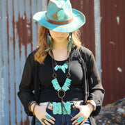 This Imperial Jasper Slab Necklace with Fringe Tassel combines vegan leather and genuine imperial jasper stones to create a boho chic style. Elevate any outfit with the unique and eye-catching design of this necklace. Perfect for those looking to add a touch of sophistication to their style.