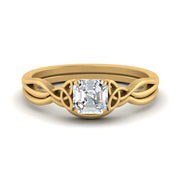 Celtic knots embraces the shoulders of this romantic ring, while elegant twisted split shank adorns the band along with a prong set center stone of your choice. The curved wedding band is designed to hug the ring perfectly.
