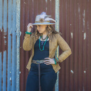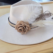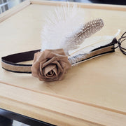 Add a touch of boho elegance to your favorite hat with this handcrafted leather hat band. Featuring a large soft silk flower and natural feathers in a warm hue, it offers a unique, stylish accent that enhances your look with effortless charm. Perfect for those who love distinctive, artisanal accessories that stand out.