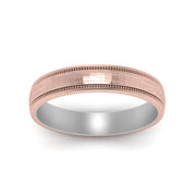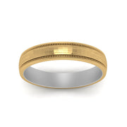 The Milgrain 2 Tone Wedding Band from Fascinating Diamonds presents a brushed center flanked by double inlays and intricate milgrain edges. The two-tone metal blend delivers a bold yet elegant finish, making it a perfect choice for those who appreciate timeless craftsmanship with a modern twist.