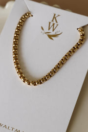 Introducing the Nova Chain Bracelet - a stunning accessory featuring a round gold box chain with a gold lobster clasp and end chain with a coin drop. The perfect blend of elegance and edge, this bracelet will elevate any outfit with its sleek, modern design.