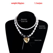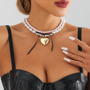 Pearl Bead Neckchain Black Ribbon Bowknot Heart Pendant Necklace