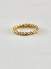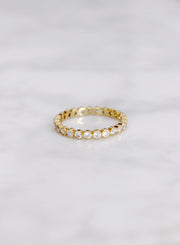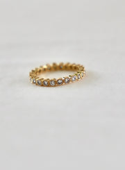 Our Round Eternity Band features clear cubic zirconia wrapped around the entirety of the ring with gold plating detail. This is the perfect stacking ring, to be worn on its own, or in addition to an engagement ring!