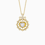 This captivating necklace tells a story of love that transcends time. At its center, a radiant heart symbolizes the enduring power of compassion, resilience, and selfless love. Encircled by a delicately sculpted crown, the heart reflects the strength it takes to face life’s challenges, while the flames rising from the top represent passion, transformation, and the courage to love deeply.