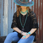 Turquoise Long Beaded Necklace with Antique Copper Cross 255r