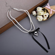 Vintage Love Charm Double Layer Pearl Choker Necklace Ribbon Bow