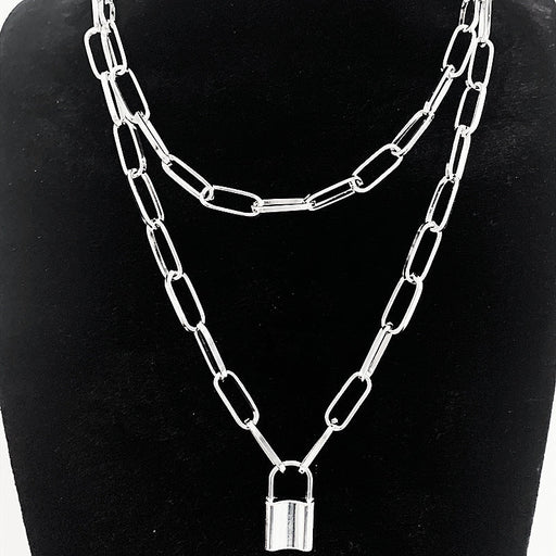 Punk Double Layer Lock Chain Necklace Padlock Pendant for Women