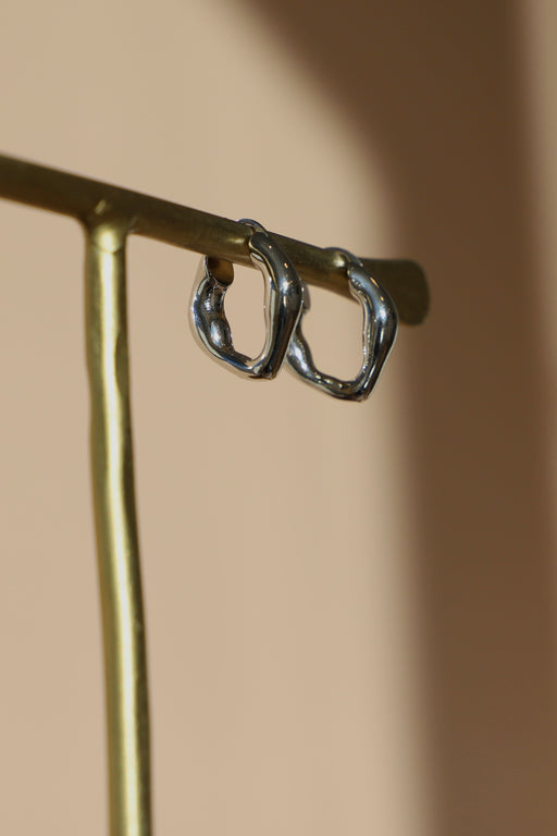 View full detailsChunky silver leverback organic hoops. Details: - Leverback - Rhodium Plated - 1" SKU: E1687 Materials+Care