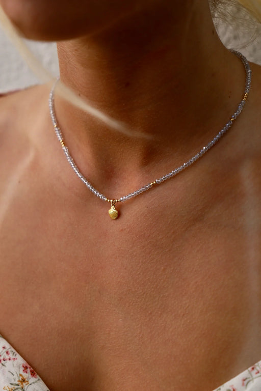Crystal beaded necklace with gold filled accent beads and petite scallop shell pendant Has an adjustable chain closure Measures 15"-16.5" long