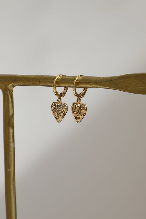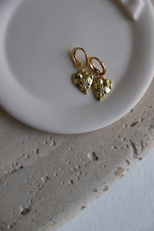 Heart Huggies with cz starburst Materials: gold plated brass and cz Length: 1" with the heart .5" SKU: E1683