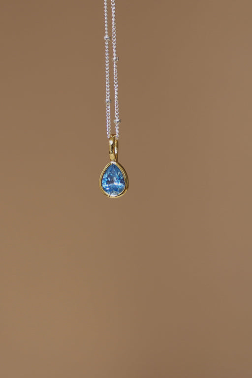 View full detailsThe Aqua Teardrop Necklace is an elegant two tone style necklace, perfect for pairing with both gold and silver pieces. The aqua colored cz charm a...