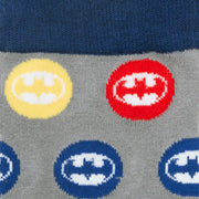 Be the superhero you know you are from top to toe, with these novelty Batman socks. Colorful dots of yellow, red, and blue, each featuring the Batman logo, appear scattered against a pale gray background, while a cushiony-soft navy band at the opening helps keeps these socks in place all day. Officially licensed by DC Comics.