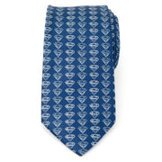 Rows of Superman shield motifs alternate in a gray to blue tonal gradient design on our Superman Shield Multi Blue Tie. The blue base emphasizes the subtle change in color, creating a unique look. Imbued with the power of superhero craftsmanship, our Silk Blend tie is built to withstand the mightiest battles while making sure you'll always maintain your sharp, heroic look. Pairs well with our Silver Superman Shield Cufflinks. Officially licensed by DC Comics.