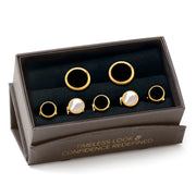 Our Double Sided Gold Onyx Stud Set is perfect for that special occasion. A round beveled edge of gold plated base metal borders Onyx stone for a sophisticated look. The details continue to the back of the cufflinks where the fixed backing closure features the same beveled edge around a Mother of Pearl center. The studs have the same round beveled shape and are double sided to be worn with all Mother of Pearl, Onyx, or if you're feeling adventurous, you can alternate which stone shows. Our stud set will stand up to wear and maintain their sleek look thanks to being crafted from durable base metal.